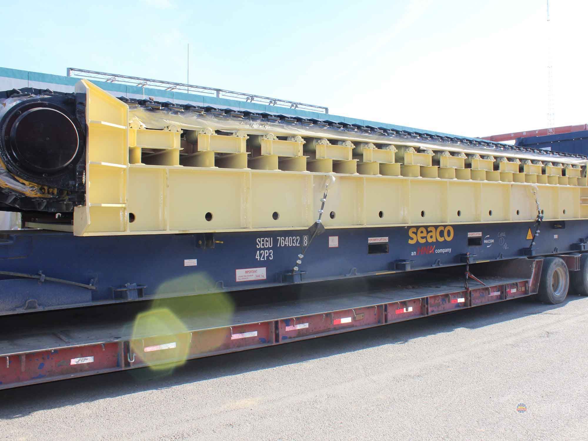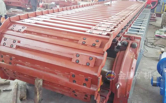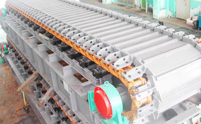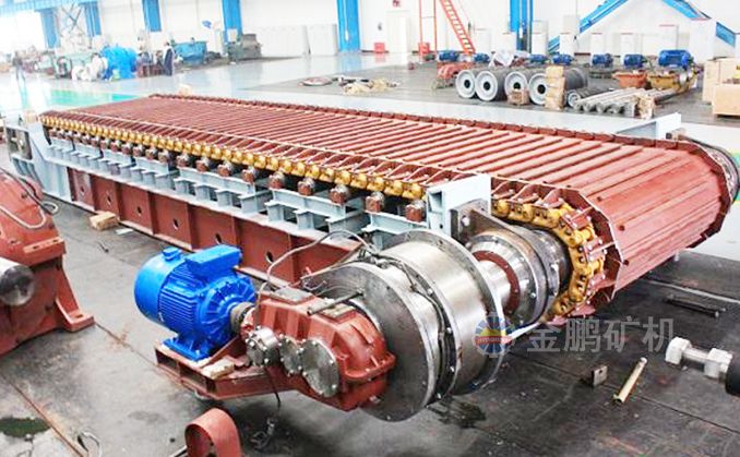 采用節(jié)距為200mm的高強(qiáng)度模鍛鏈條為牽引件,兩根鏈條繞過安裝在機(jī)體頭部的一對(duì)驅(qū)動(dòng)鏈輪和機(jī)體尾部的一對(duì)張緊輪聯(lián)成封閉形回路,在兩排鏈條的每個(gè)鏈節(jié)上裝配了相互交迭的、重型結(jié)構(gòu)的輸送槽而成為一個(gè)連續(xù)的能夠運(yùn)載物料的輸送線路。其自重和物料的重量由安裝在機(jī)體上的多排支重輪、鏈托輪和滑道梁支承。傳動(dòng)系統(tǒng)經(jīng)交流變頻調(diào)速電動(dòng)機(jī)聯(lián)接減速機(jī),再由漲套與驅(qū)動(dòng)裝置直聯(lián)驅(qū)動(dòng)運(yùn)載機(jī)構(gòu)低速運(yùn)行。將尾部料倉(cāng)卸入的物料沿輸送線路運(yùn)至機(jī)體的前方排出,實(shí)現(xiàn)向下方的工作機(jī)械連續(xù)均勻喂料的目的。