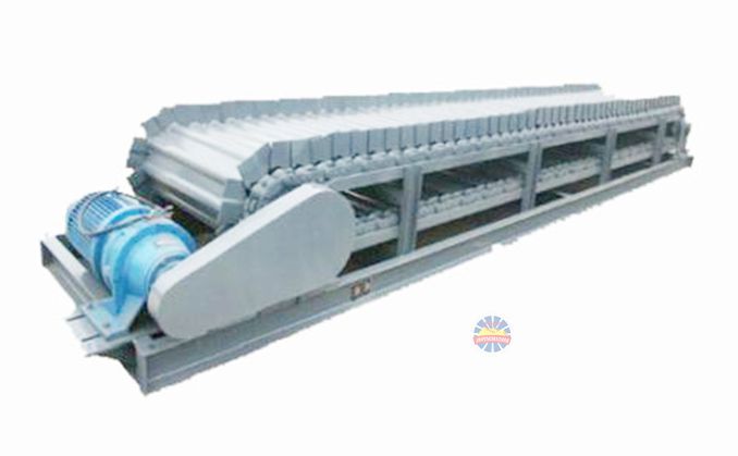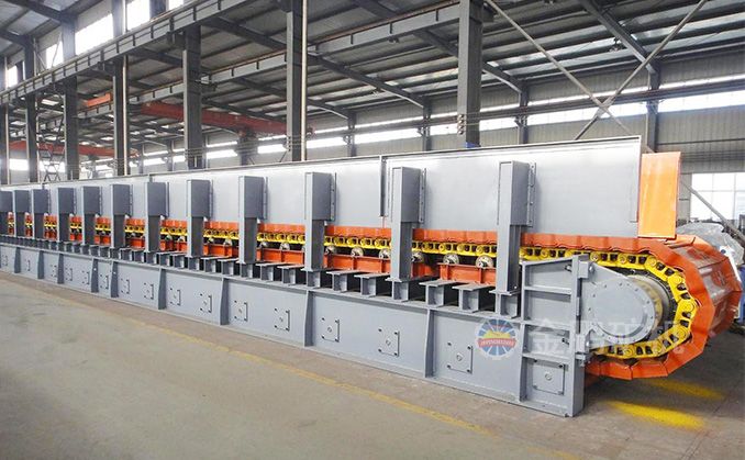 采用節距為150mm的高強度模鍛鏈條為牽引件,兩根鏈條繞過安裝在機體頭部的一對驅動鏈輪和機體尾部的一對張緊輪聯成封閉形回路,在兩排鏈條的每個鏈節上裝配了相互交迭的、輕型結構的輸送槽而成為一個連續的能夠運載物料的輸送線路。其自重和物料的重量由安裝在機體上的多排支重輪、鏈托輪和滑道梁支承。傳動系統經交流變頻調速電動機聯接減速機,再由漲套與驅動裝置直聯驅動運載機構低速運行。將尾部料倉卸入的物料沿輸送線路運至機體的前方排出,實現向下方的工作機械連續均勻喂料的目的。