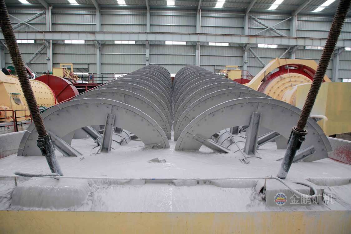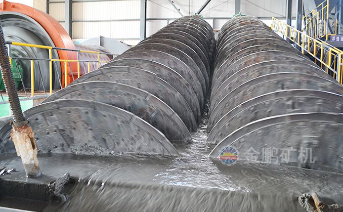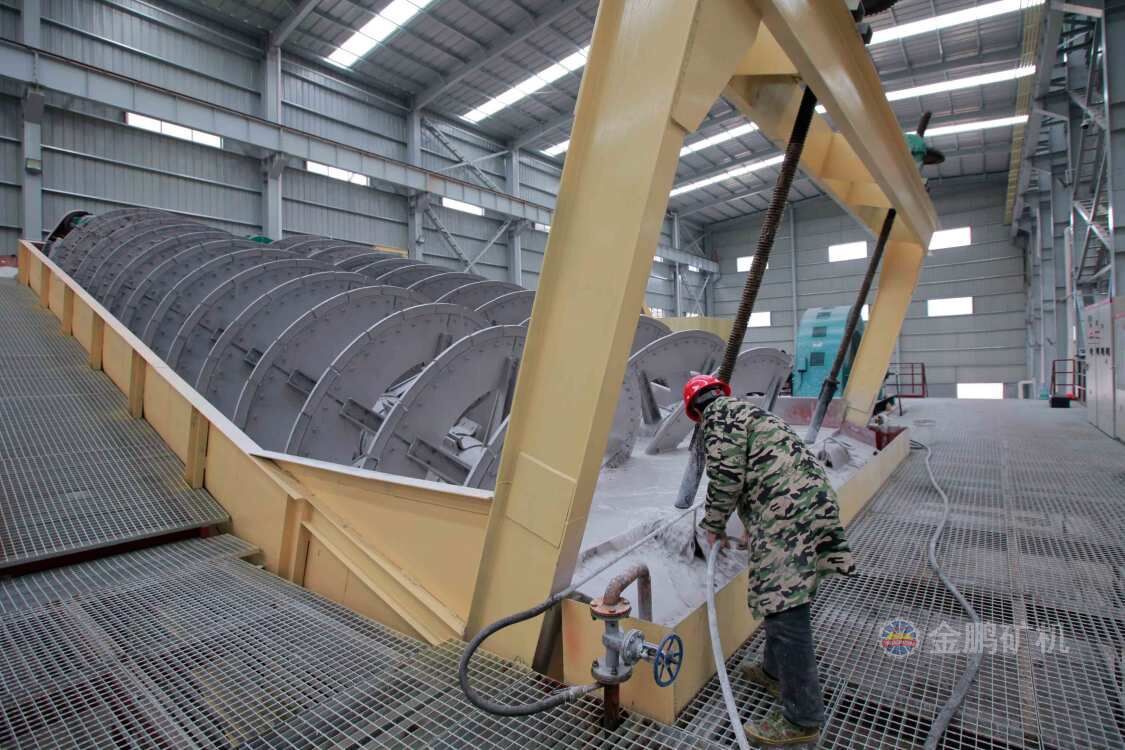 高堰式螺旋分級機采用將磨細后的礦漿從位于沉降區中部的進料口給入水槽,傾斜安裝的水槽下面是礦漿分級沉降區,螺旋低速轉動,對礦漿起攪拌作用,使細顆粒懸浮到上面,流到溢流堰處溢出。粗顆粒沉到槽底,由螺旋輸送到排料口作為返砂排出。溢流堰的位置高于螺旋軸下端的軸承中心,低于溢流端螺旋上緣。