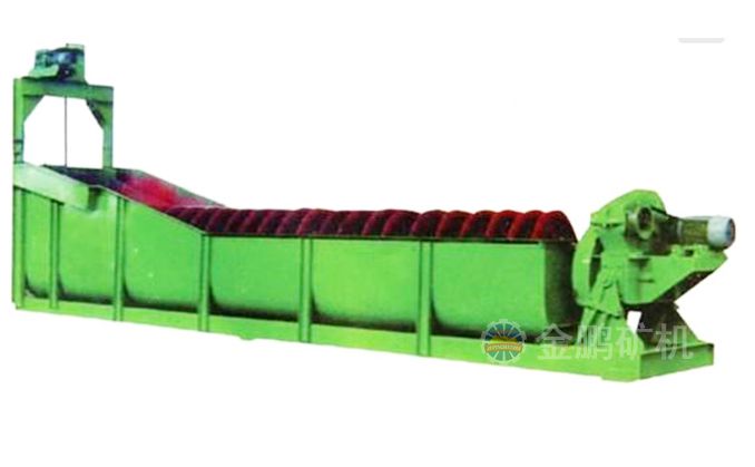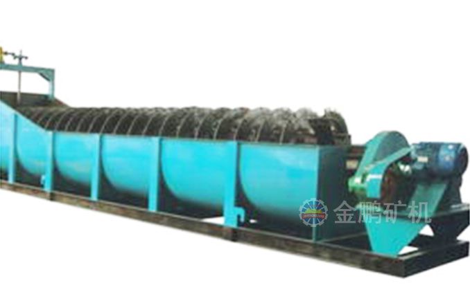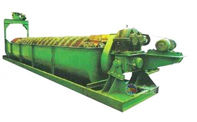 沉沒式螺旋分級機是借助于固體粒大小不同、比重不同,因而在液體中的沉降速度不同的原理,細礦粒浮游在水中由溢流堰溢出,粗礦粒沉于槽底,由螺旋推向上部排出,來進行機械分級的一種分級設備。通過螺旋低速轉動,對礦漿起攪拌作用使細顆粒懸浮到上面,流到溢流堰處溢出,粗顆粒沉到槽底,由螺旋輸送到排料口作為返砂排出。