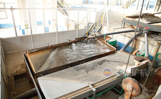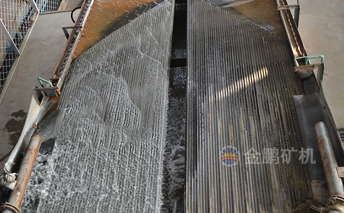 礦粒群從6s搖床床面上角的給礦槽送入,同時由給水槽供給橫向沖洗水,于是礦粒在重力,橫向流水沖力,床面作往復(fù)不對稱運(yùn)動所產(chǎn)生的慣性和摩擦力的作用下,按比重和粒度分層,并沿床面作縱向運(yùn)動和沿傾斜床面作橫向運(yùn)動。比重和粒度不同的礦粒沿著各自的運(yùn)動方向逐漸扇形流下,分別從搖床精礦端和尾礦側(cè)的不同區(qū)排出,最后被分成精礦,中礦和尾礦。